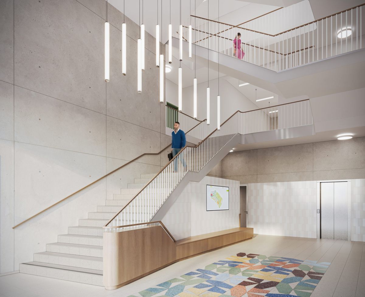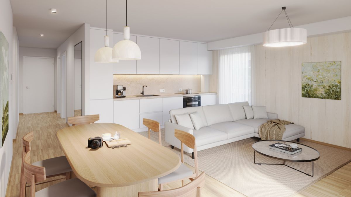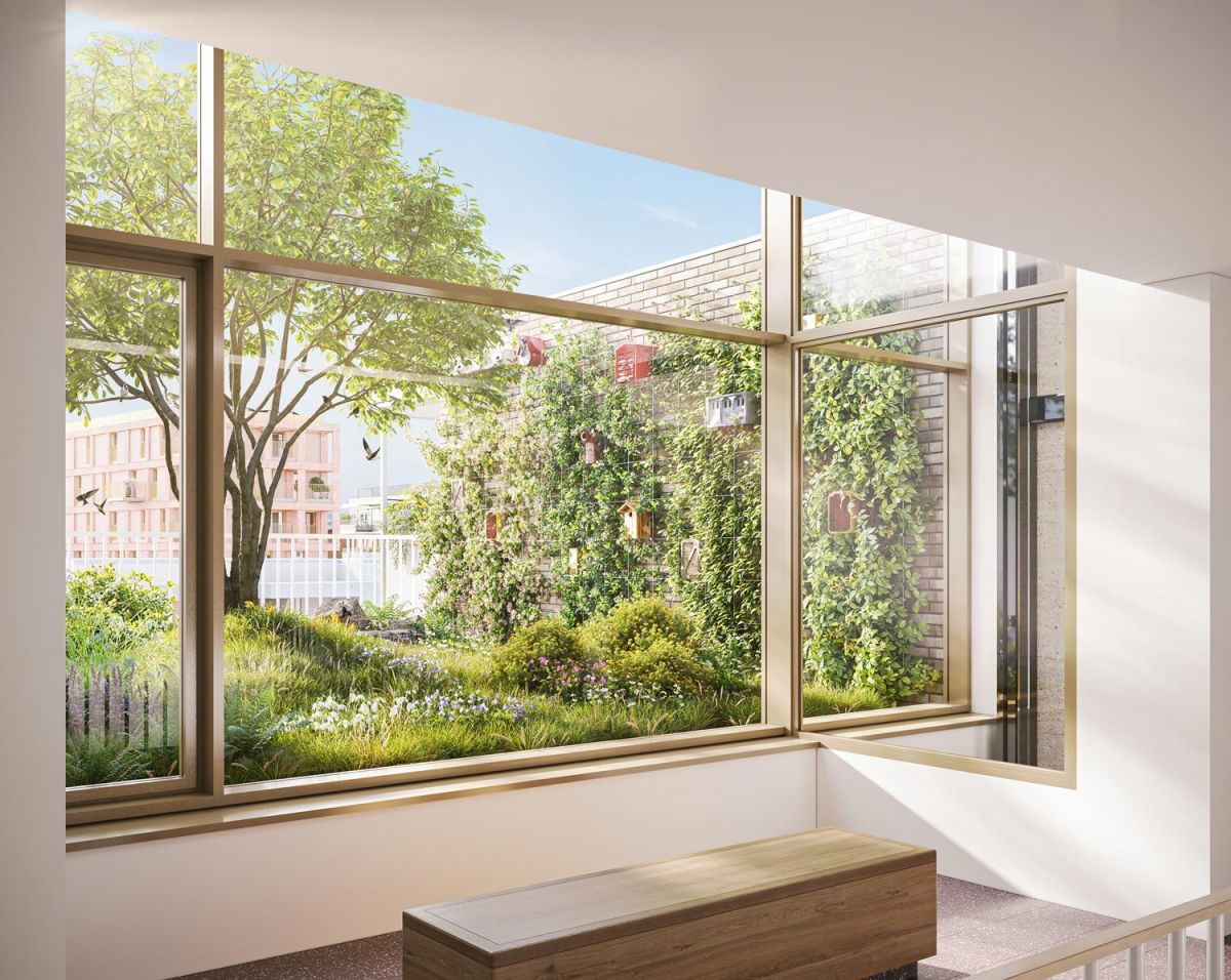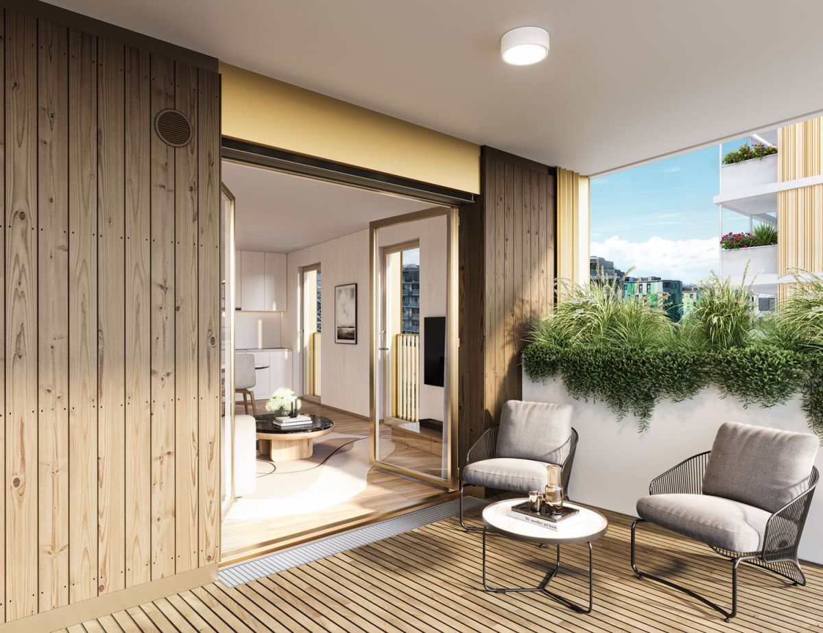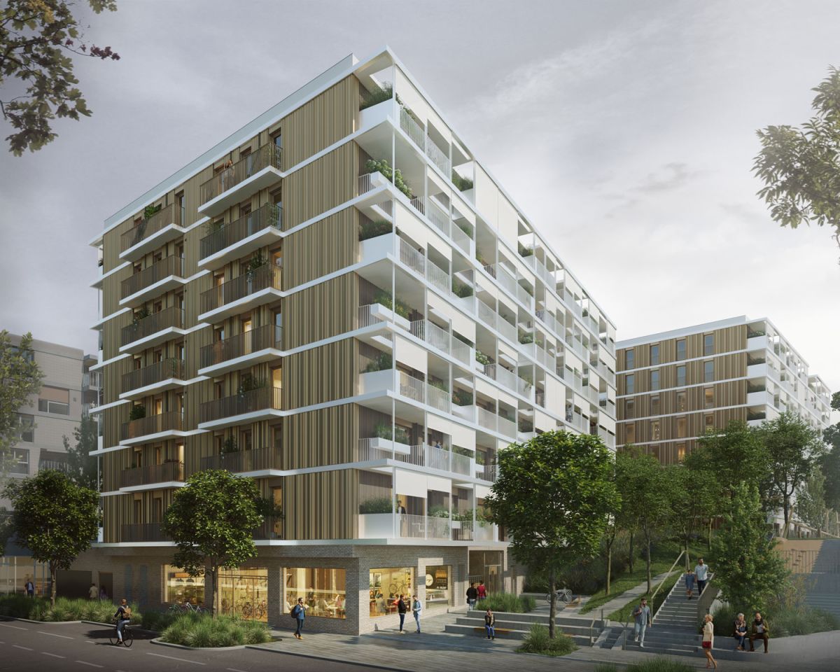 Zwei moderne Wohnhäuser mit 126 Eigentumswohnungen verbinden den Anspruch auf nachhaltiges Bauen mit dem Wunsch nach hohem Wohnkomfort. Die Holz-Hybridbauweise sorgt für ein natürliches Wohngefühl. Die Außenwände aus Holzriegelkonstruktion prägen die sechs bzw. sieben Obergeschoße und verleihen den Gebäuden ihre warme, natürliche Ausstrahlung. Jede Wohnung verfügt über eine private Freifläche – sei es Balkon, Loggia oder Terrasse – und bietet damit einen Rückzugsort im Grünen. Außenliegende Raffstores sowie Zip-Screens sorgen für sonnengeschützten Wohnraum sowohl innen als auch im Freien. Balkone und Loggien werden zusätzlich mit Pflanztrögen ausgestattet, die das Wohnen „Natürlich Draußen“ erlebbar machen.